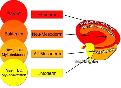 Während das Entoderm eindeutig vom Althirn und das Ektoderm eindeutig vom Neuhirn/Großhirn gesteuert wird, lässt sich erkennen, dass das Meso derm teilweise im Althirn und teilweise im Neuhirn/Großhirn gesteuert wird. Die genauere Aufspaltung des Althirns in Stammhirn und Kleinhirn und des Neuhirns in Marklager und Großhirnrinde lässt die eindeutige Zuordnung erkennen.